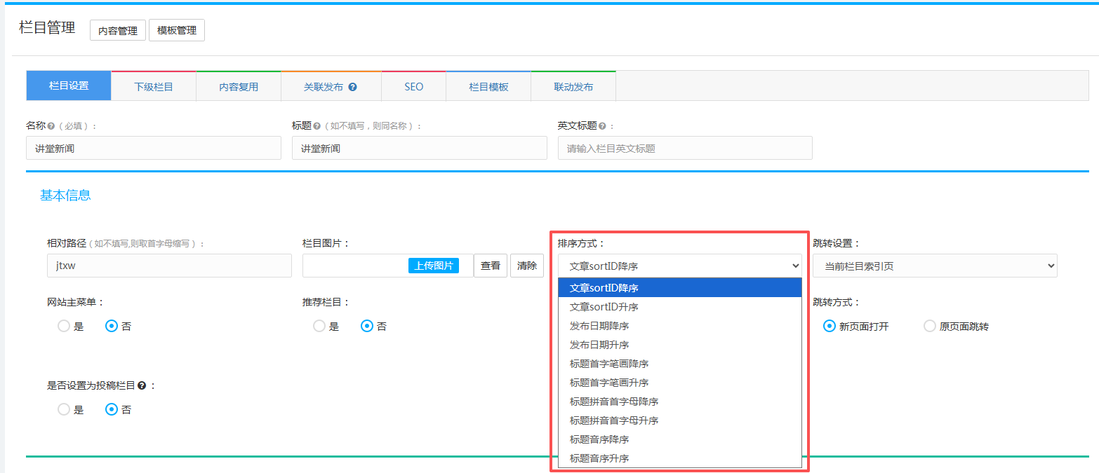 创建栏目时,系统默认按照发布日期降序排列文章。