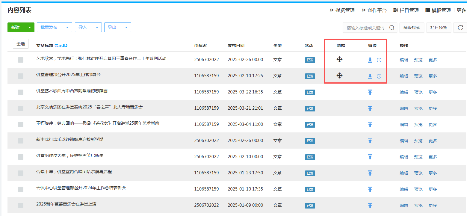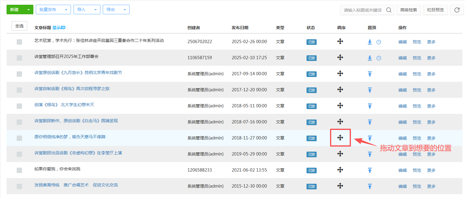 按发布日期排序的栏目,文章不能调序,可以设置文章是否置顶,多篇置顶文章之间可以拖动文章调序。