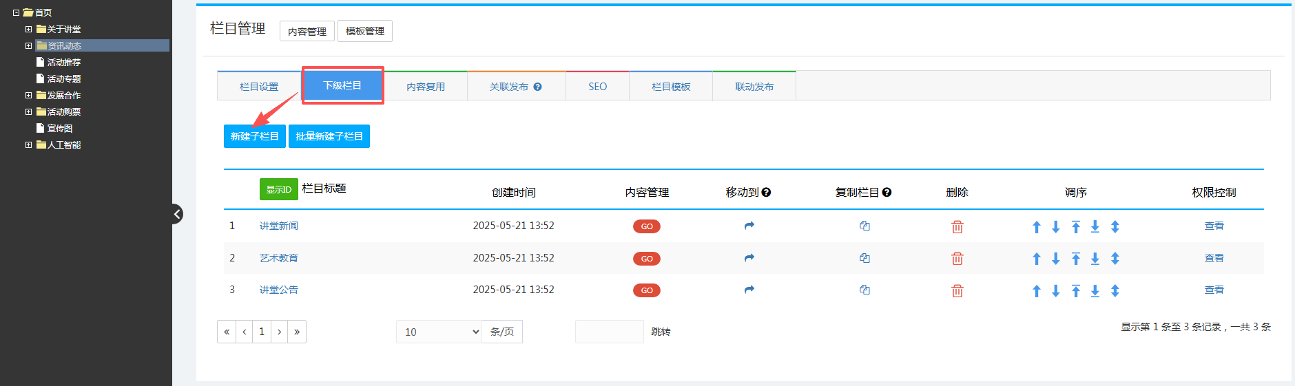 在哪个栏目新增子栏目,点击左侧的对应栏目,右侧<主操作区>显示对应的栏目设置,选择<下级栏目>