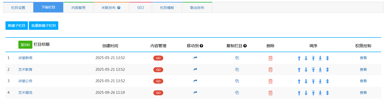 点击<功能区>的【栏目管理】进入栏目管理页面