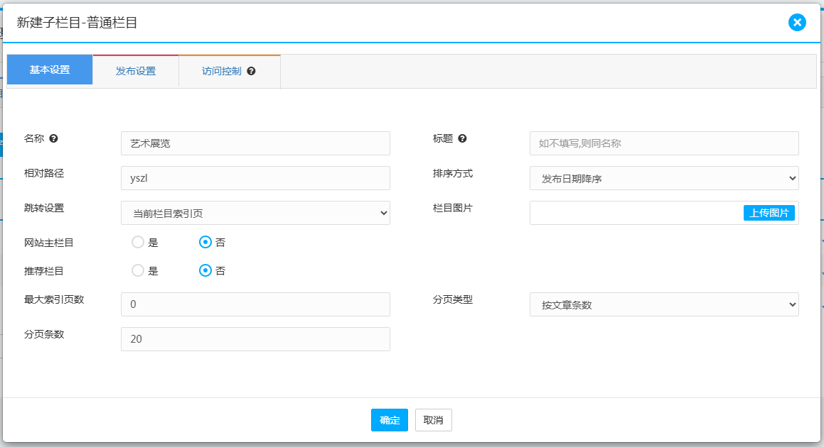 在基本设置中,输入创建栏目的名称,标题如不填写,与名称相同。