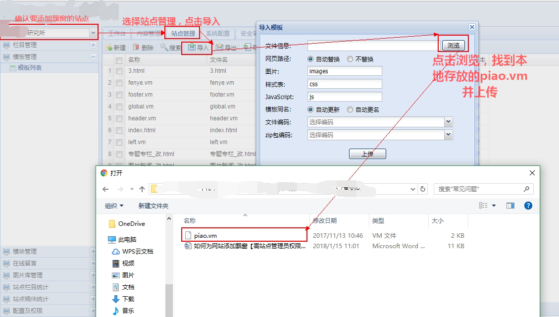 2、上传至cms后台,并保证piao.vm的类型为包含